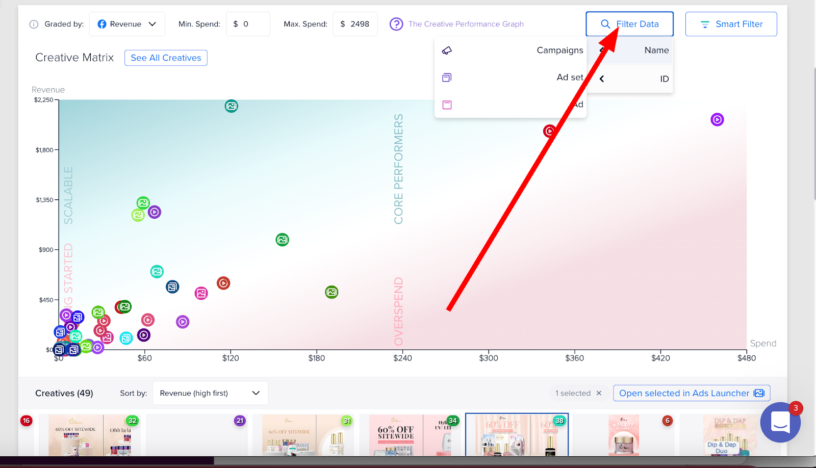 You can search for any metric and see your best and worst-performing campaigns for every KPI (metric) in a particular funnel stage. For example, you can search and find which of your ad sets drive the highest ROAS with a minimum amount spent. These ads would typically be scaleable.